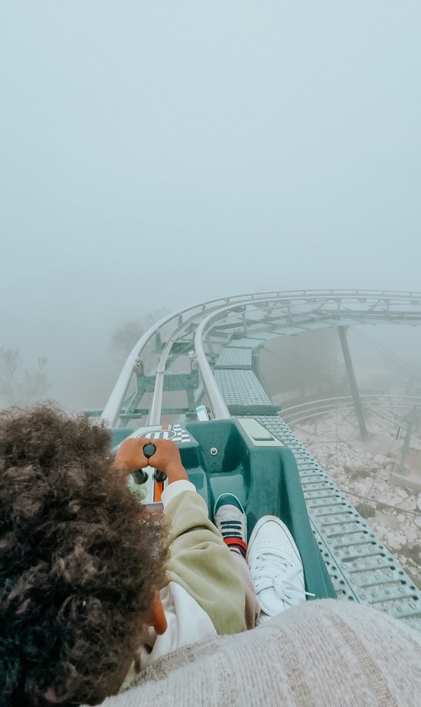 Suddenly—bam—we’re at the Alpine Coaster ready for the ride of a lifetime… inside a cloud.