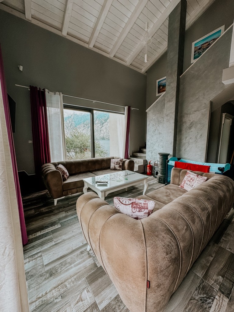 Inside, the chic modern living room seamlessly connects comfort with the breathtaking Montenegrin landscape.