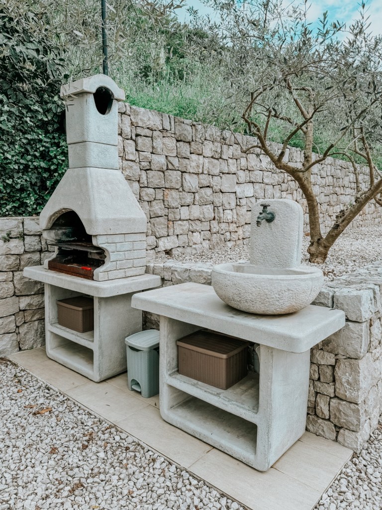 Just steps away, you’ll find a charming rustic stone setup, complete with a classic open-air grill and an artisan-style stone sink.